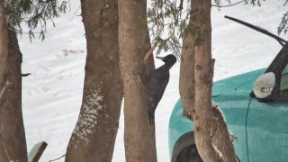 餌を求めて山から里に降りてきたクマゲラ。家の窓から見える駐車場を囲むように植えてある樹に止まり幹をつついています。