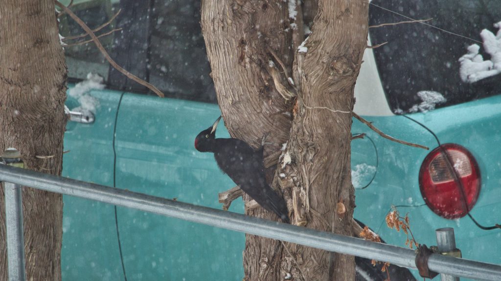 数日後に再び、そこを通った時には人も鳥の気配もなくなっていましたので、そのクマゲラは巣を放棄してしまったのかも知れません。