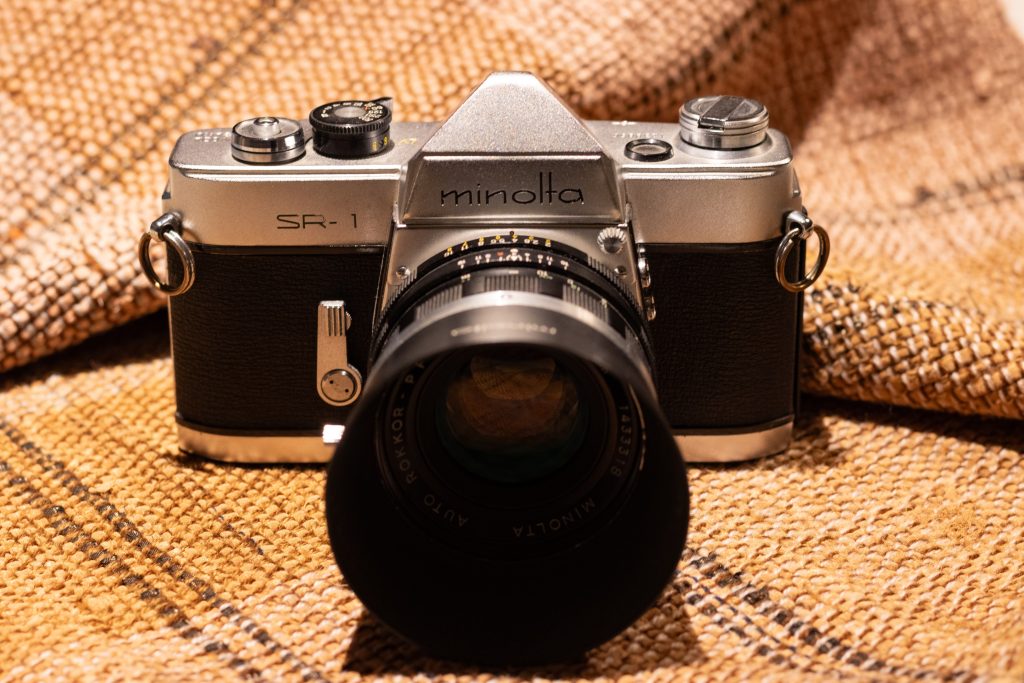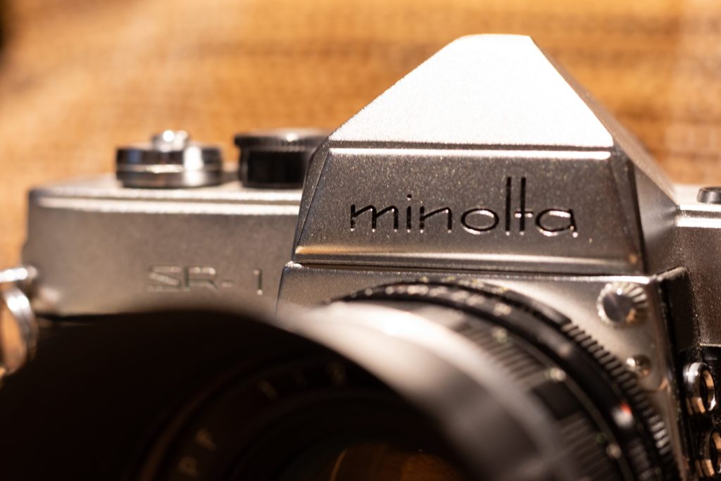 同年代に作られた機種でありながら、シンプルな直線で構成されたNikonFとは方向性の違うデザイン性も、なかなか魅力的で、例えばキューバの街を走っているような、装飾的な要素を含んだデザインのクラッシックカーのような趣があります。またこのカメラのペンタ部ですが、私にはエベレストの頂のようにも見えるのです。その下には頭文字が小文字の「minolta」。この奥ゆかしくて小洒落た、感じの良さに世界はもっと気付くべきだと個人的には思います。