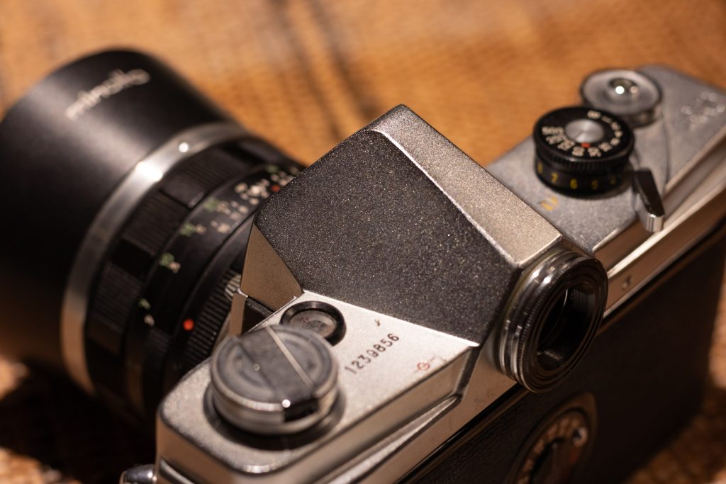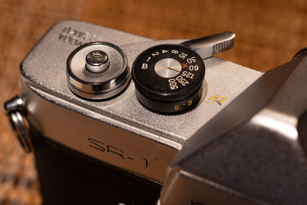 このカメラのチャームポイントは全身機械であるということであり、後発機に付与された露出計ソケットもなく、ただこのボディーのみで完結されているという潔さなのではないかと思っています。それ故、ペンタ部に取り付け可能なストロボを載せるアダプターのない姿こそが私にとってのSR-1の完璧な姿と言えます。