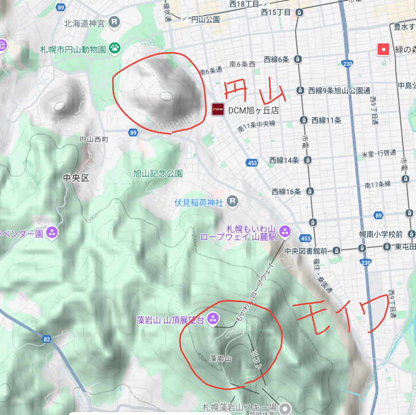 それはおそらく、山が円かったからなのだと思います。確かに円いので。ちなみに街中から見て、円山の裏手には「三角山」という山もあります。黒い猫だから黒猫みたいに、なんだか、とてもざっくりとしています。